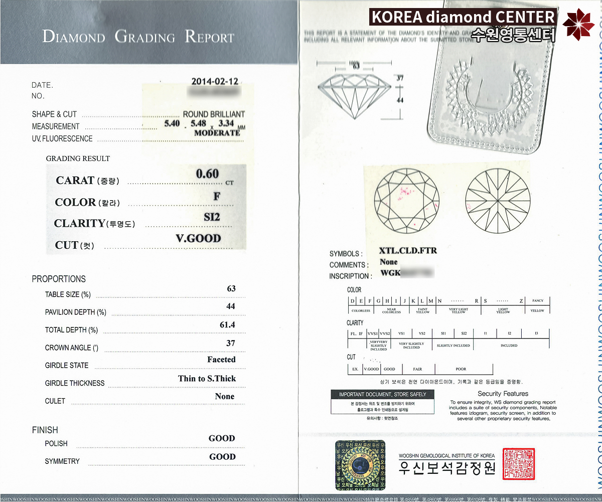 우신다이아매입 고객님께서 가져오신 우신감정서입니다. 우신감정서의 내용을 먼저 확인하고 셋팅된 상태에서 고객님의 다이아몬드 상태를 확인해 보았습니다.