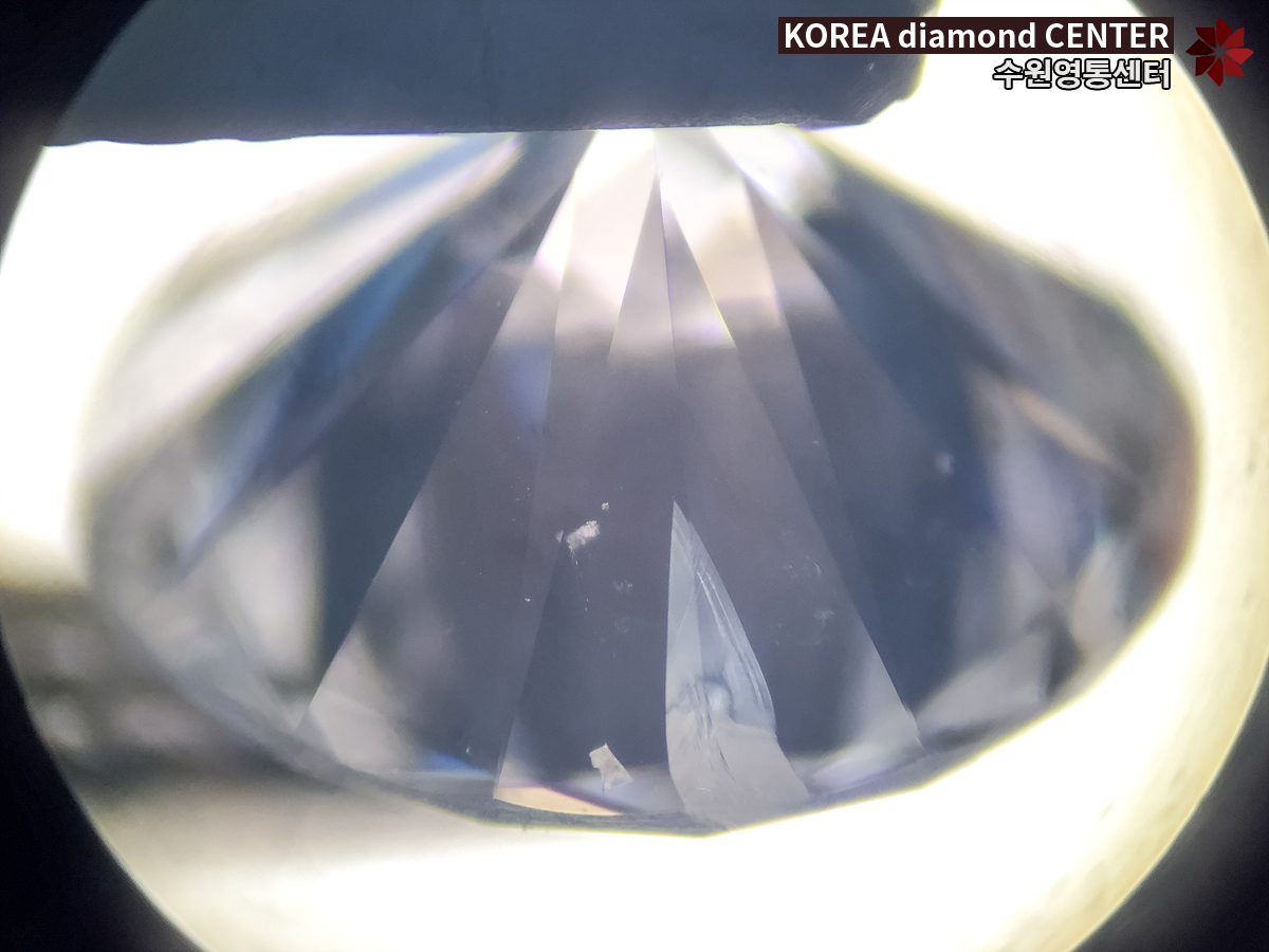 그런데 아랫부분에서 확인을 해보니 정면에서 보았을 때보다 더 큰 상태임을 확인할 수 있었는데요. 현대 감정서의 작도 표기와는 일치하였지만 페더 내포물의 위치와 크기 등을 따져봤을 때 SI2 등급 중에서도 선호도가 낮은 편으로 확인이 되어 5부다이아매입 가격에도 영향을 줄 것으로 예상이 되었습니다. 고객님께서도 실상태를 직접 확인하시고는 적잖이 당황한 반응을 보이셨습니다.