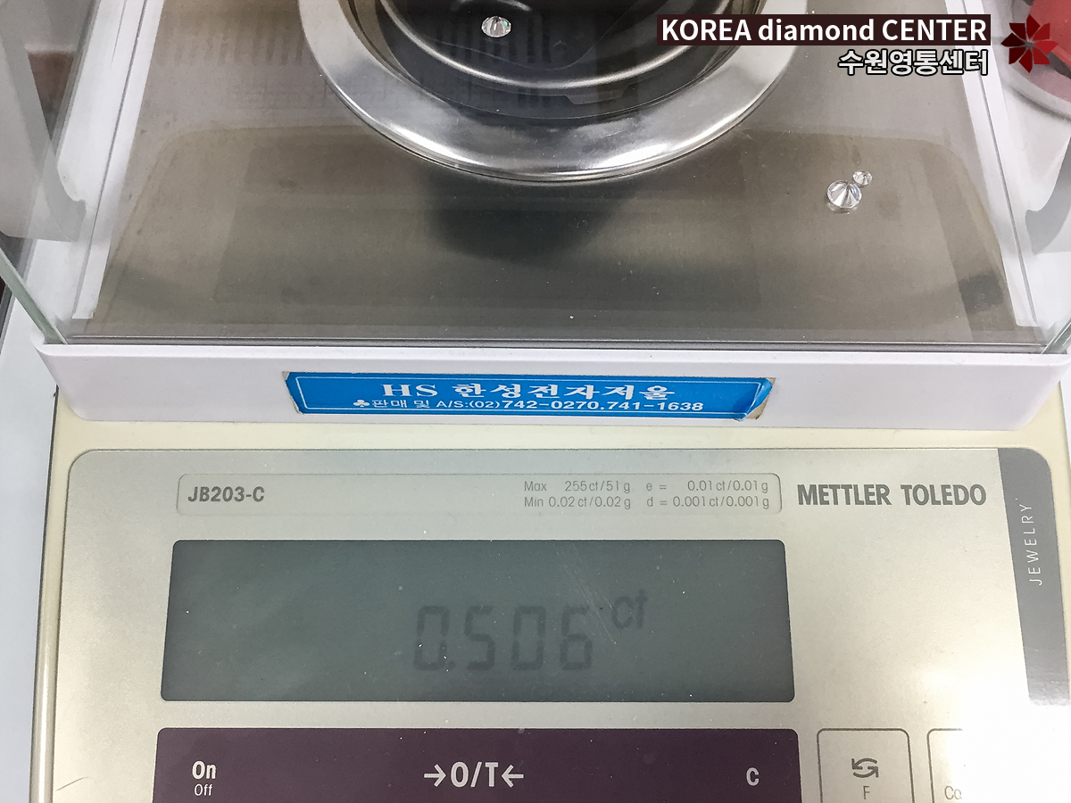 Carat (중량) 5부다이아매입 고객님의 다이아몬드를 나석 상태에서 중량을 측정한 결과 0.506ct, 0.50ct로 현대 감정서와 일치하는 것을 볼 수 있었습니다. 다이아몬드의 중량은 1부가 변화하는 사이즈일 때 소수점 세 번째 자리가 9일 경우 여러 번 측정하여 반올림이 되기도 합니다. 또한 여유 중량이 있을 경우 컷 등급을 보완하더라도 중량을 보존할 수 있다는 장점이 있습니다.