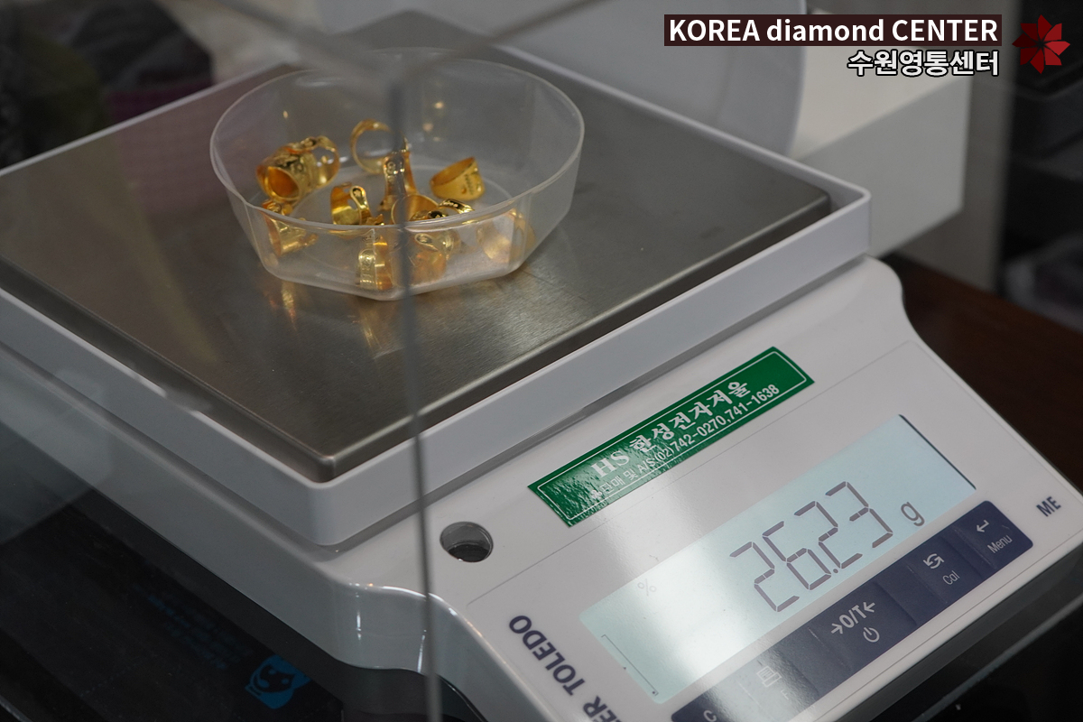 수원영통센터에 금 제품을 가지고 오시면 제품에 새겨진 각인 혹은 시금석과 분해 용액을 이용해 함량을 확인하여 분류합니다. 이후 금 함량별로 분류한 제품들의 무게를 측정하고 당일 수원금시세로 금매입을 진행하는데요. 순금 제품의 경우 분석비라는 비용이 차감되지만 그 외의 제품들은 별도의 차감되는 비용이 없습니다. 금매입은 수원금시세가 인터넷에 어느 정도 공개가 되어 있기 때문에 투명하고 믿을 수 있는 곳에서 거래하는지가 더 중요하며 수원영통센터는 모두 고객님의 눈앞에서 이루어지고 있어 믿고 거래하실 수 있습니다.