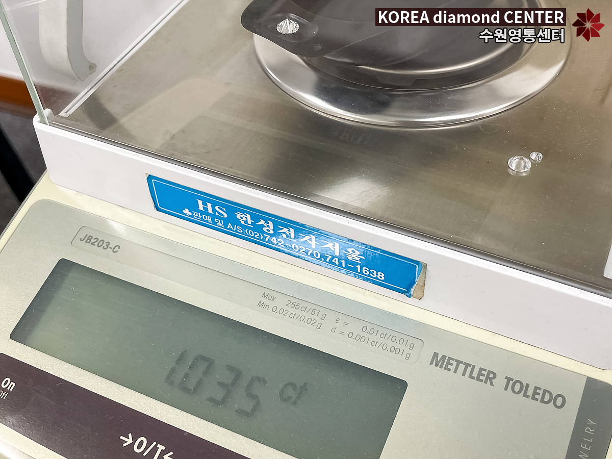Carat (중량) 고객님의 다이아몬드를 분리 후 나석 상태에서 중량을 측정한 결과 1.035ct, 1.03ct 1캐럿다이아몬드임을 확인할 수 있었습니다. 다이아몬드의 중량은 1부가 변화하는 사이즈일 때 소수점 세 번째 자리가 9일 경우 여러 번 측정하여 반올림이 되기도 합니다. 1부가 변하는 사이즈의 경우 동탄 1캐럿다이아몬드 가격에도 영향을 주기 때문에 반드시 확인하셔야 하는 부분입니다.