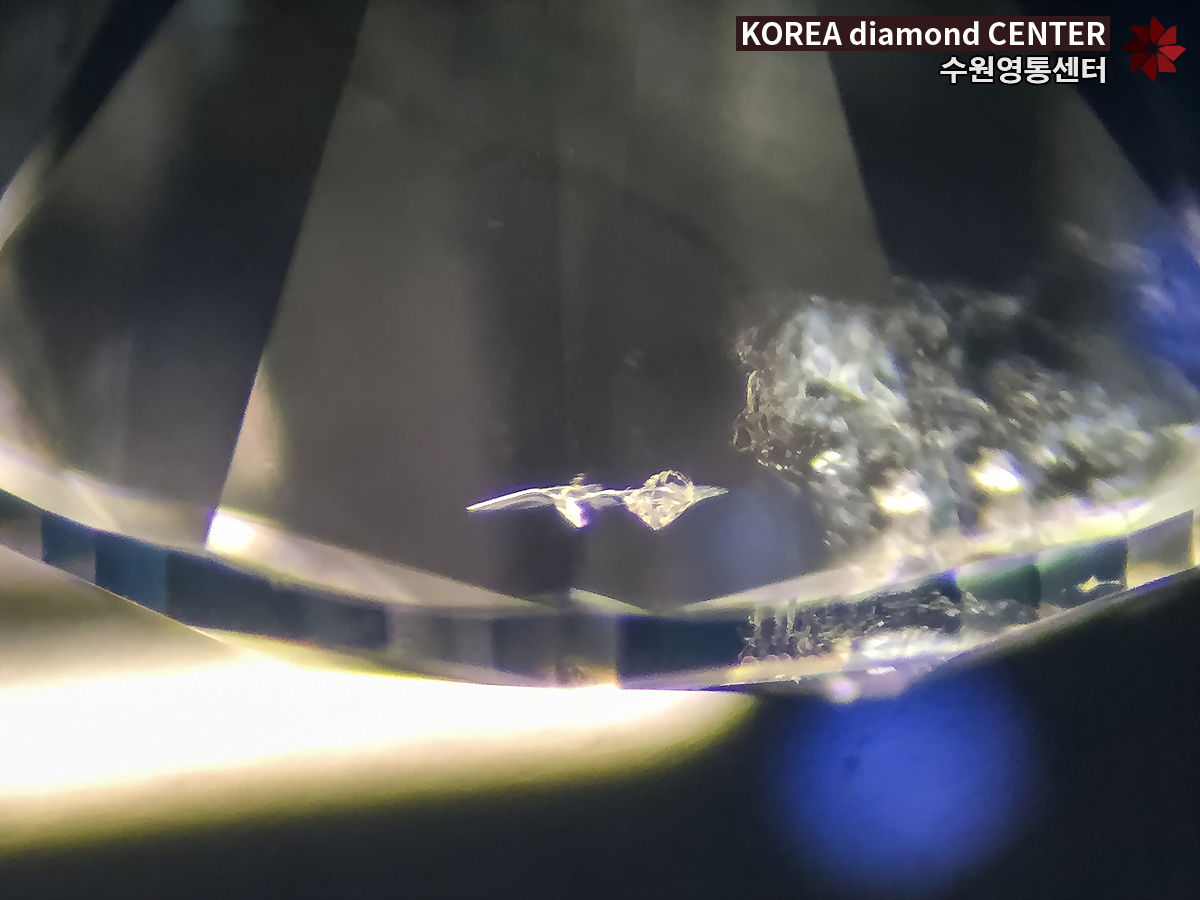 이어서 다이아몬드의 아랫부분까지 꼼꼼하게 확인한 결과 다이아몬드 거들에서 N(내추럴)을 확인할 수 있었고, 정면에서 보이지 않았던 Xtl(크리스탈) 내포물도 확인할 수 있었습니다. 전체적으로 우신 감정서에 작도 표기된 부분들과 일치하였지만 반사되는 상태나 내포물의 상태 등을 따져 보았을 때 SI2 등급 치고는 실상태가 좋은 편은 아닌 것으로 확인되었습니다.