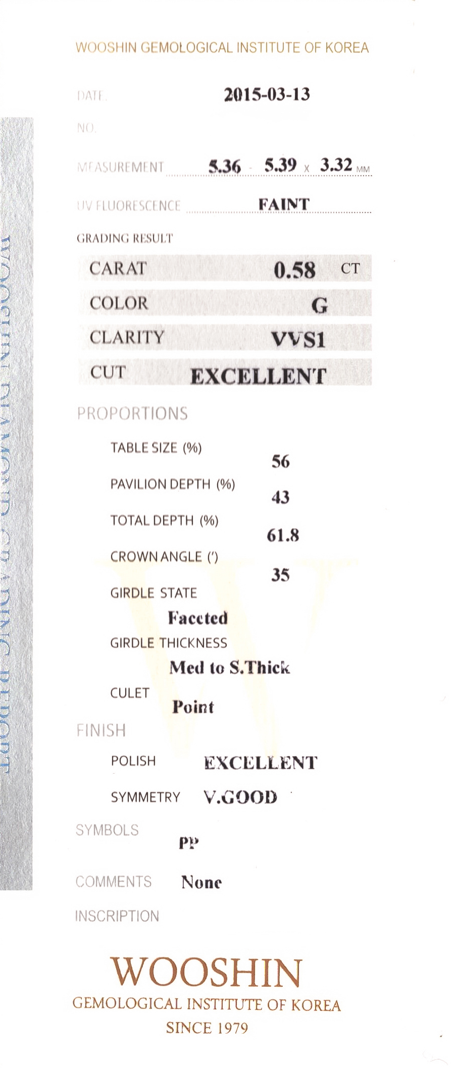 마지막으로는 우신 다이아몬드 감정서의 가장 우측에 있는 부분으로 붙어있는 경우도 있지만 없는 경우도 있는데요. 2페이지에 걸쳐 기재된 다이아몬드의 상태를 작도 표기를 제외하고 요약해 놓은 것으로 분리할 수 있게 점선으로 나누어져 있습니다.