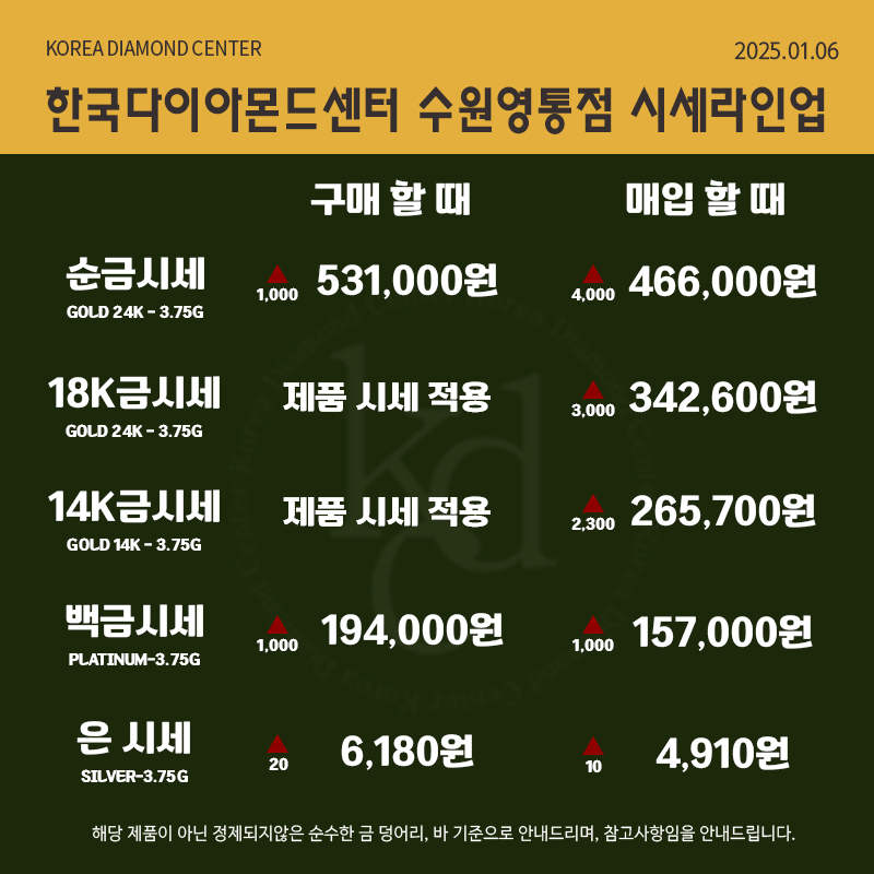 | 2025년 1월 4일 오늘의 금시세 24K, 18K, 14K 금매입 (0) | 2025.01.04 |
