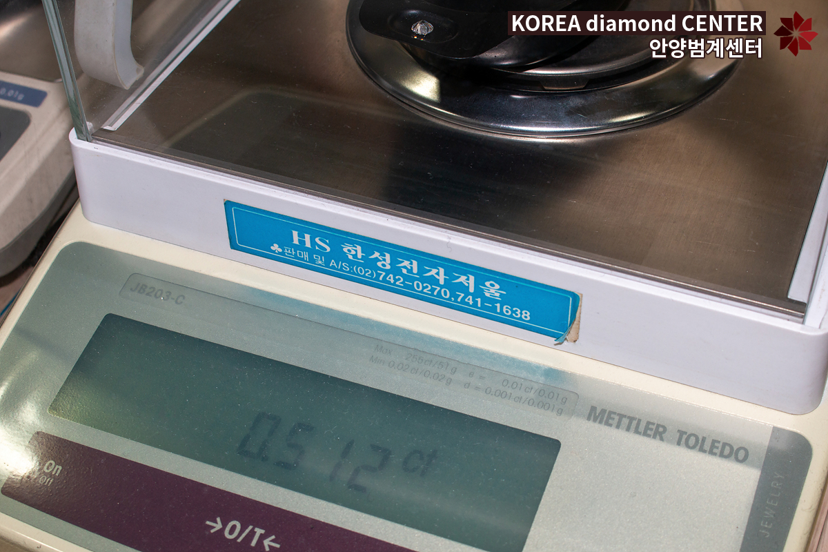 다이아몬드 전용 저울을 이용해 고객님의 다이아몬드를 측정한 결과 0.512ct로 0.51ct 5부다이아몬드임을 확인하였습니다. 다이아몬드의 중량 측정은 소수점 세 번째 자리까지 측정을 하지만 감정서에는 소수점 두 번째 자리까지만 기재하며 1부가 변화하는 사이즈의 경우일 때 소수점 세 번째 자리가 9일 경우 여러 번 측정하여 반올림이 되기도 합니다. 1부가 변하는 사이즈의 경우 매입 가격에도 영향을 주니 반드시 확인하시길 바랍니다.