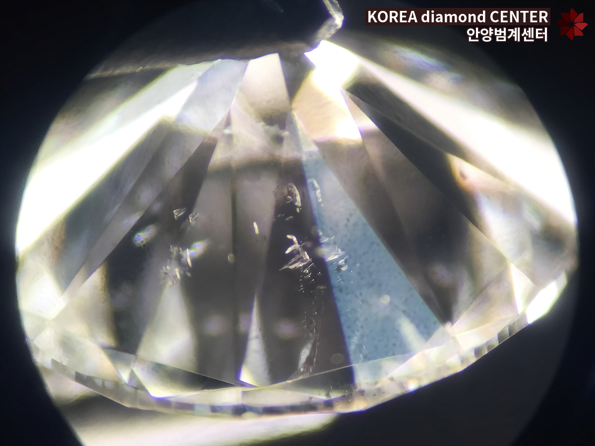 다음으로 아랫부분을 관찰한 결과 아랫부분에서도 여러 개의 크고 작은 Xtl(크리스탈), Ftr(페더), Cld(클라우드) 까지 발견이 되며 같은 SI2 등급 중에서도 내포물의 개수가 많이 관찰되는 지저분한 상태를 확인할 수 있었습니다.