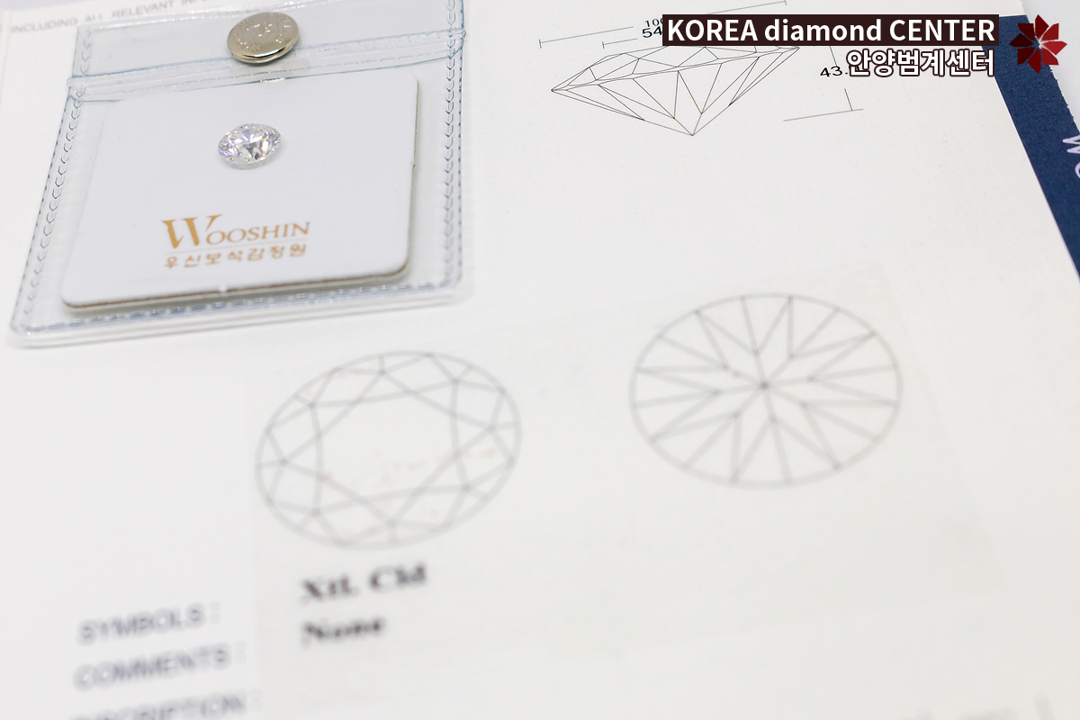 다음으로는 다이아몬드의 내포물의 종류와 위치 수량 등을 표기한 작도 상태의 모습입니다. 고객님의 우신1캐럿다이아몬드는 Xtl(크리스탈), Cld(클라우드) 내포물이 있지만 비교적 사이드쪽에 위치하는 것으로 표기되어 있었습니다. 고객님께 작도 표기된 내포물의 종류에 대해 설명을 드리고 현미경을 이용해 직접 다이아몬드의 상태를 보여드렸습니다. 뿐만 아니라 우신 감정서의 리포트 넘버와 봉인된 우신1캐럿다이아몬드의 거들 부분에 새겨진 리포트 넘버 각인이 일치하는 것도 확인을 시켜드렸는데요. 직접 눈으로 직접 다이아몬드의 상태와 작도 표기가 일치하는지 확인하실 수 있는 곳에서 구입하시는 것을 추천드립니다.