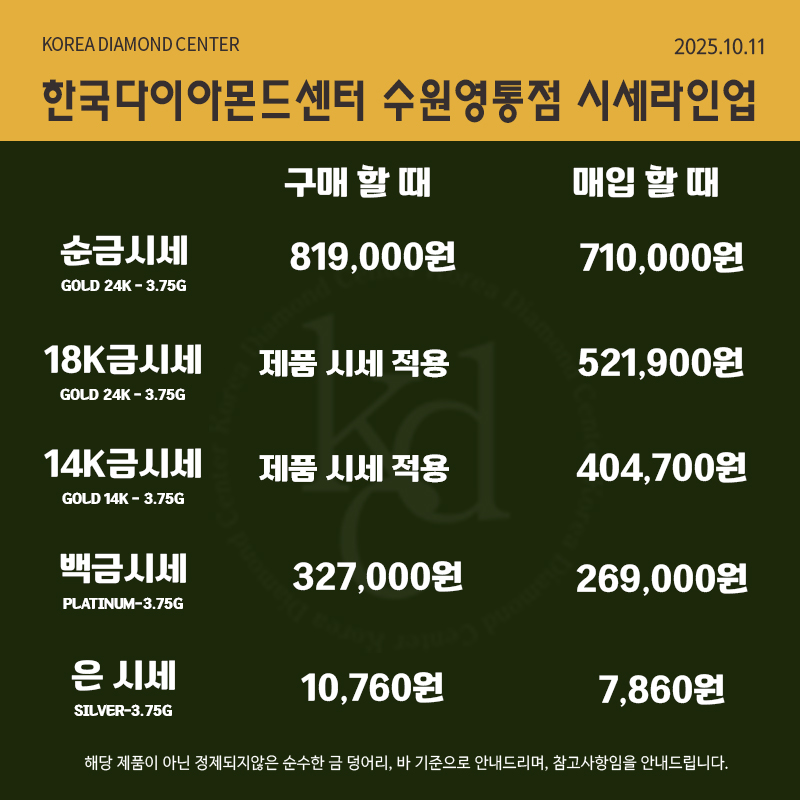 2025년 10월 11일 오늘의 금시세 순금 24K, 18K, 14K 금매입