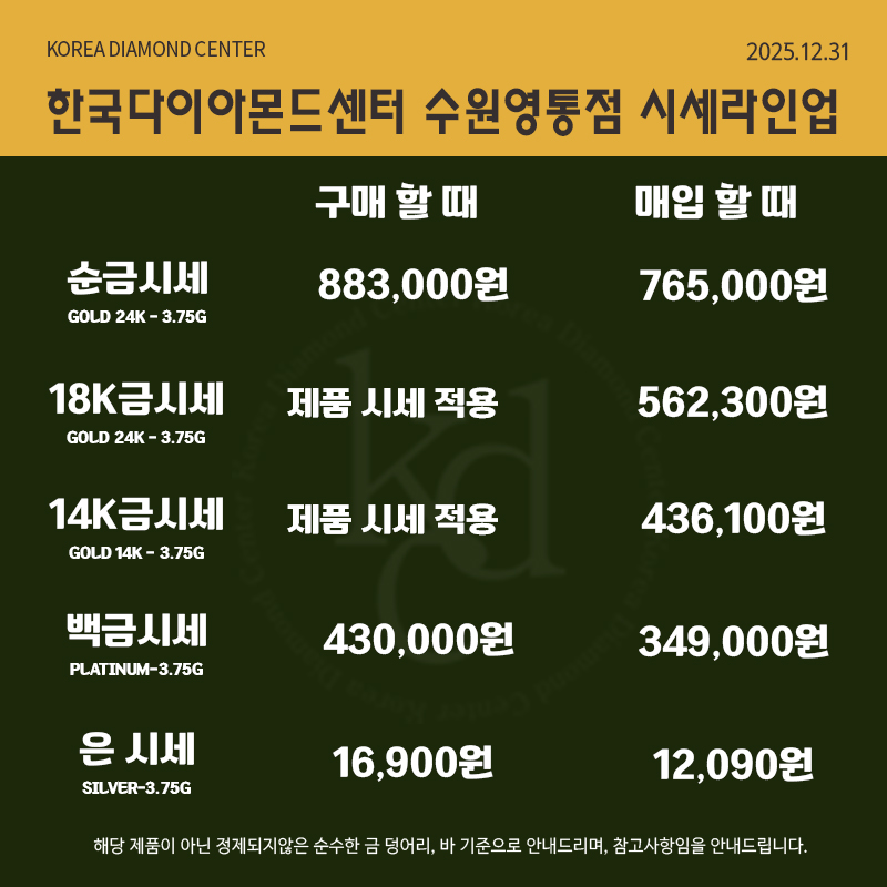 | 오늘 수원 금시세 바로 확인! 1월 5일 순금 24K부터 14K까지 얼마? (0) | 2026.01.05 |