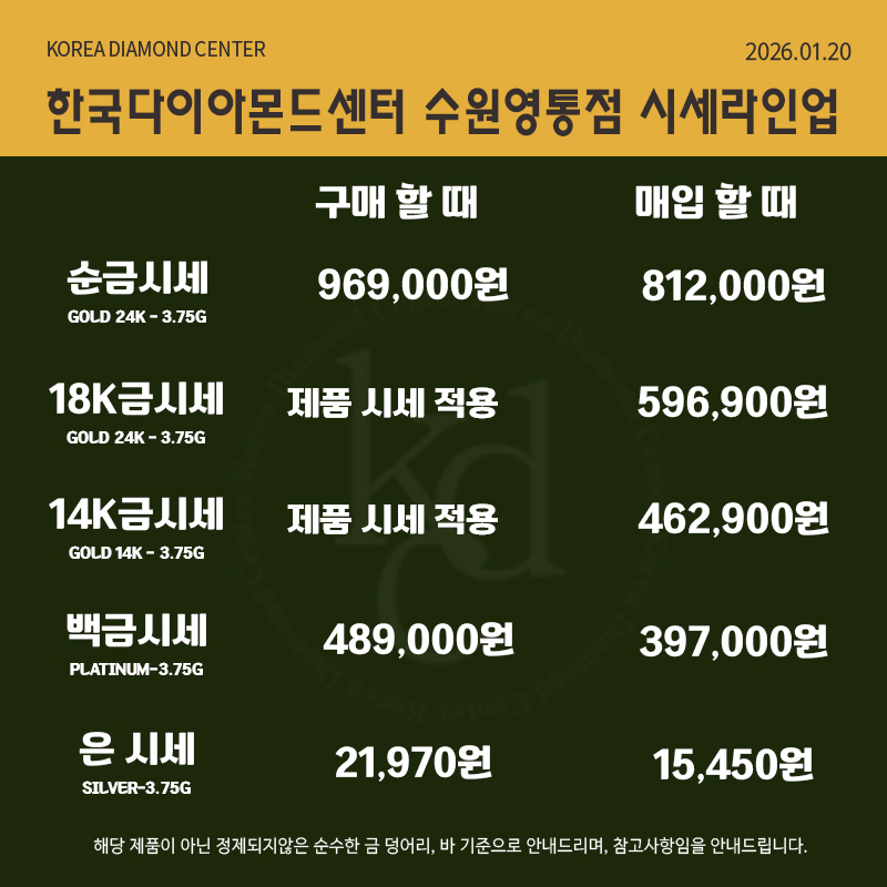 | 오늘 영통역 금시세 바로 확인! 1월 19일 순금 24K부터 14K까지 얼마? (0) | 2026.01.19 |