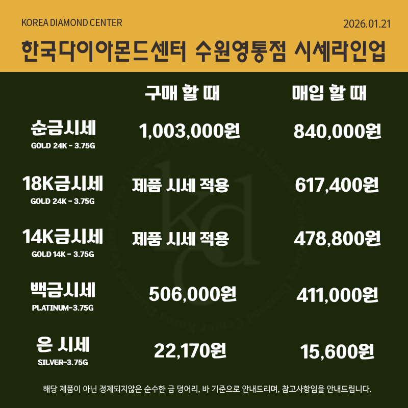 | 오늘 매교 금시세 바로 확인! 1월 22일 순금 24K부터 14K까지 얼마? (0) | 2026.01.22 |