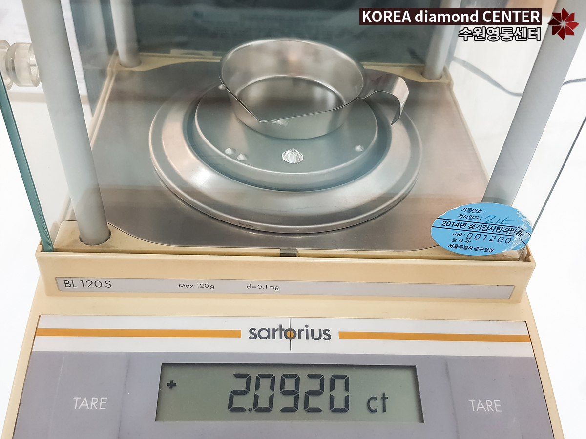 Carat (중량) 2캐럿다이아매입 고객님의 다이아몬드를 나석 상태에서 중량을 측정한 결과 2.092ct, 2.09ct 2캐럿 다이아몬드임을 확인할 수 있었습니다. 다이아몬드의 중량은 1부가 변화하는 사이즈일 때 소수점 세 번째 자리가 9일 경우 여러 번 측정하여 반올림이 되기도 합니다. 1부가 변하는 사이즈의 경우 수원 2캐럿다이아매입 가격에도 영향을 주기 때문에 반드시 확인하셔야 하는 부분입니다.