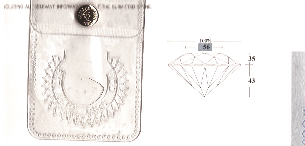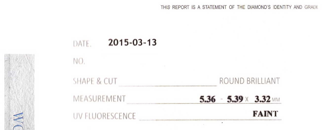 가장 먼저 기본 내용들이 기재된 부분부터 살펴보도록 할게요. 순서대로 감정서가 발행된 일자, 감정서 리포트 넘버가 적혀있는데요. 다음으로는 다이아몬드의 컷팅 형태를 기재한 것으로 일반적인 다이아몬드의 형태라면 대부분 Round brilliant 컷이라고 할 수 있습니다. 그 외의 팬시컷 다이아몬드라면 별도로 기재가 되기 때문에 확인하시길 바랍니다. 다음으로는 다이아몬드의 실측 사이즈로 정면 원의 지름과 다이아몬드의 높이를 mm 단위로 기재합니다. 마지막으로는 자외선 형광반응에 대한 등급이 기재되어 있는 것을 볼 수 있습니다.