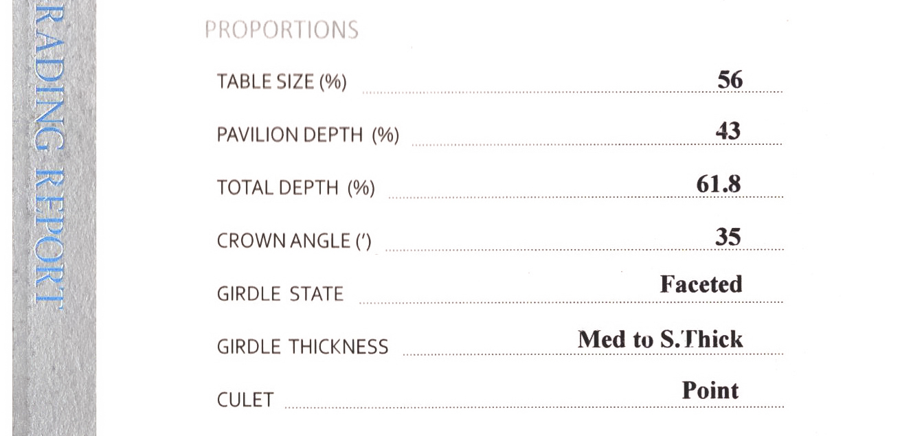 Proportions 섹션에서는 4C 등급 중 컷 등급과 관련된 내용들이 기재가 되어 있는데요. 순서대로 다이아몬드의 테이블면의 사이즈, 퍼빌리언의 깊이, 다이아몬드의 전체 높이, 크라운의 각도 등이 비율로 표기되어 있습니다. 다음으로는 거들의 형태, 거들의 두께, 큐렛의 사이즈가 기재되어 있습니다. 거들의 상태는 거들이 어떤 형태로 연마가 되었는지를 나타내는 것으로 'Faceted'가 가장 흔하고, 'waxy' 또는 'polish'인 경우도 있습니다. 다음으로 거들의 두께는 측면에서 관찰되는 다이아몬드 거들의 두께를 Thin(얇음)부터 Thick(두꺼움)까지 기재합니다. 마지막으로 큐렛의 크기는 다이아몬드의 아랫부분의 모든 패싯면들이 만나 점을 이룬 것을 말하는데요. 일반적인 다이아몬드의 큐렛 크기는 none 또는 chip으로 표기되어 있으며 크기에 따라 small, medium 등으로도 적기도합니다.