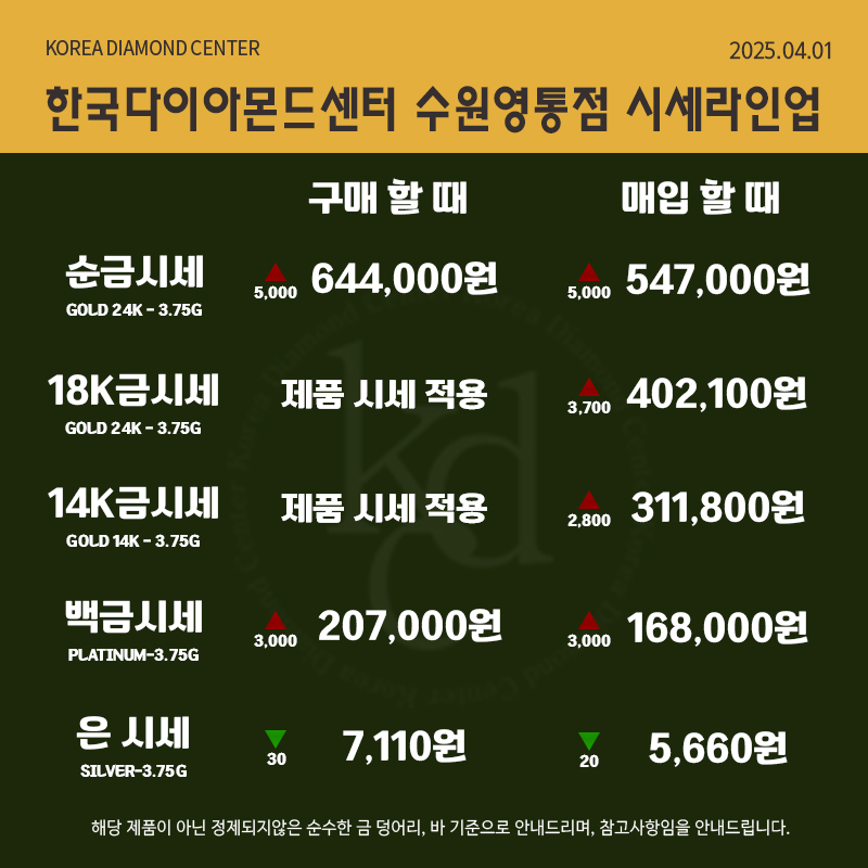 2025년 4월 1일 오늘의 금시세 순금 24K, 18K, 14K 금매입