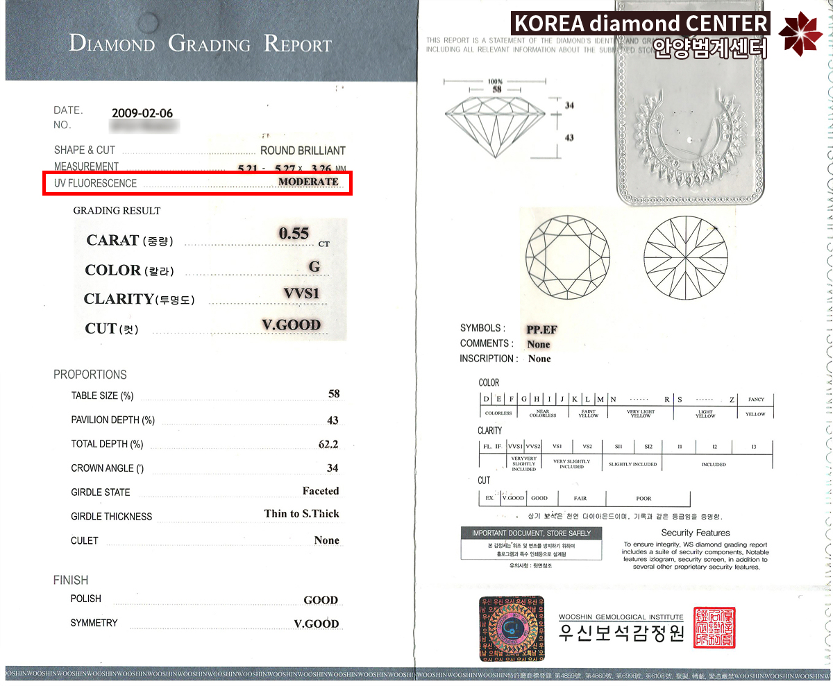 그래서 우신 감정서가 발행된 다이아는 none 등급이 아닌 faint 등급까지는 자외선 형광반응이라는 이유로 다이아 가격 차이가 크게 차이가 나지 않습니다. 하지만 moderate 등급부터는 다이아 가격 차이가 조금씩 발생하기 시작하며 strong 등급부터는 외관상 보기에도 뿌옇게 보이는 차이를 나타내는 만큼 선호도의 차이가 생겨 그만큼 다이아 가격에도 영향을 주게 됩니다.