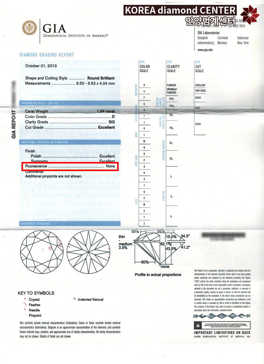다음으로 미국 GIA 감정서의 경우 우신 감정서 다이아와는 다른데요. 미국 GIA 감정서가 발행되고 국내에 유통되는 다이아 중 약 95% 이상은 자외선 형광반응이 none 등급입니다. 그렇기 때문에 약간의 반응을 보이는 faint 등급이라고 해도 다이아 시장에서 선호도의 차이가 생기며 다이아 가격 차이로 이어지게 됩니다. 일반적으로 자외선 형광반응을 보이는 GIA 다이아를 가져오신 분들께 여쭤보면 대부분 해외에서 구입을 하시는 경우가 많습니다. GIA 다이아는 자외선 형광반응에 예민한 만큼 구입하실 때에도 더 자세히 확인하시는 것이 중요합니다.
